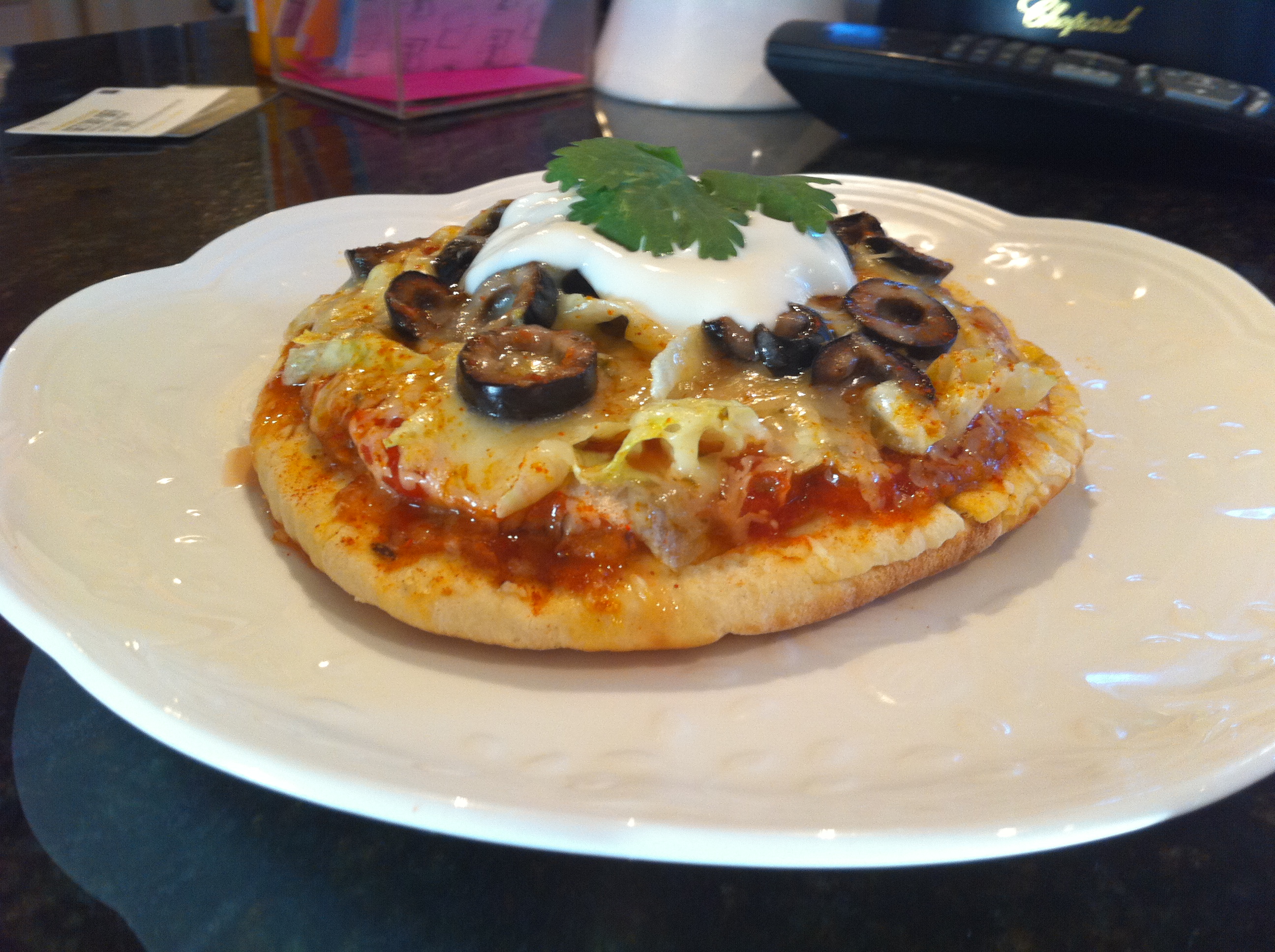 Spicy Mexican Pizza Wedges topped with a Chunky Guacamole– I left the beans semi-whole to give the pizza a little texture
