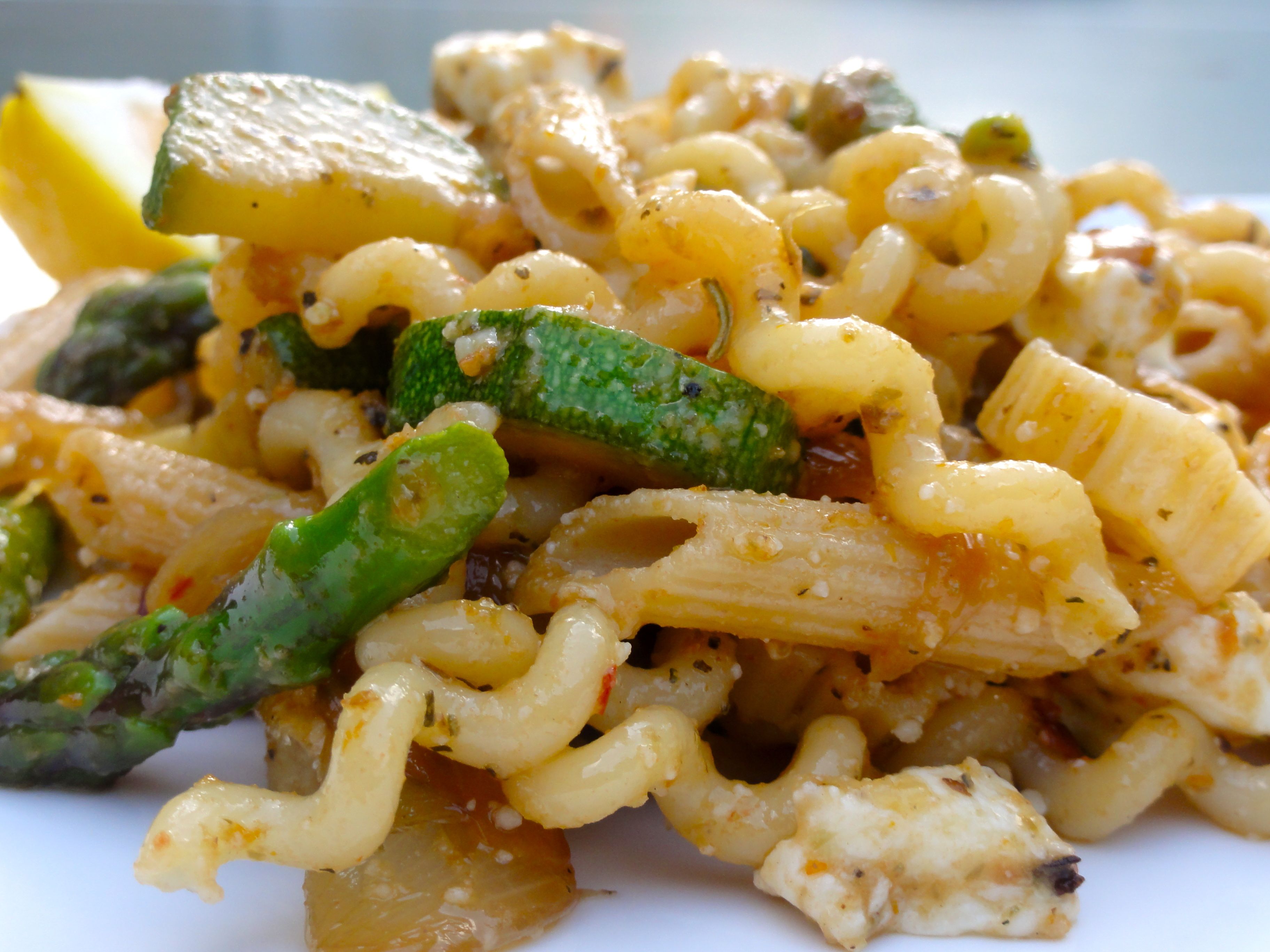 Spring Medley Pasta Salad– but with caramelized onion, zucchini and a chopped caper vinaigrette