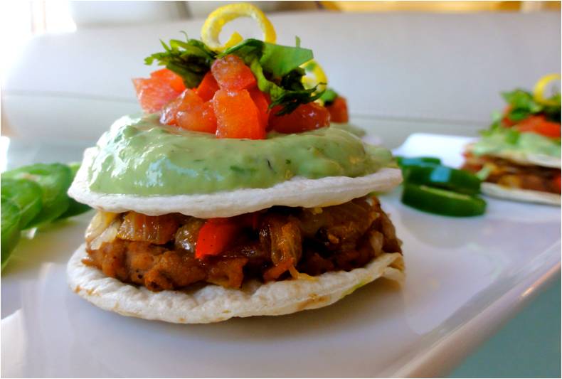 Mexican Pizza Towers with a Avocado-Jalapeno Crema