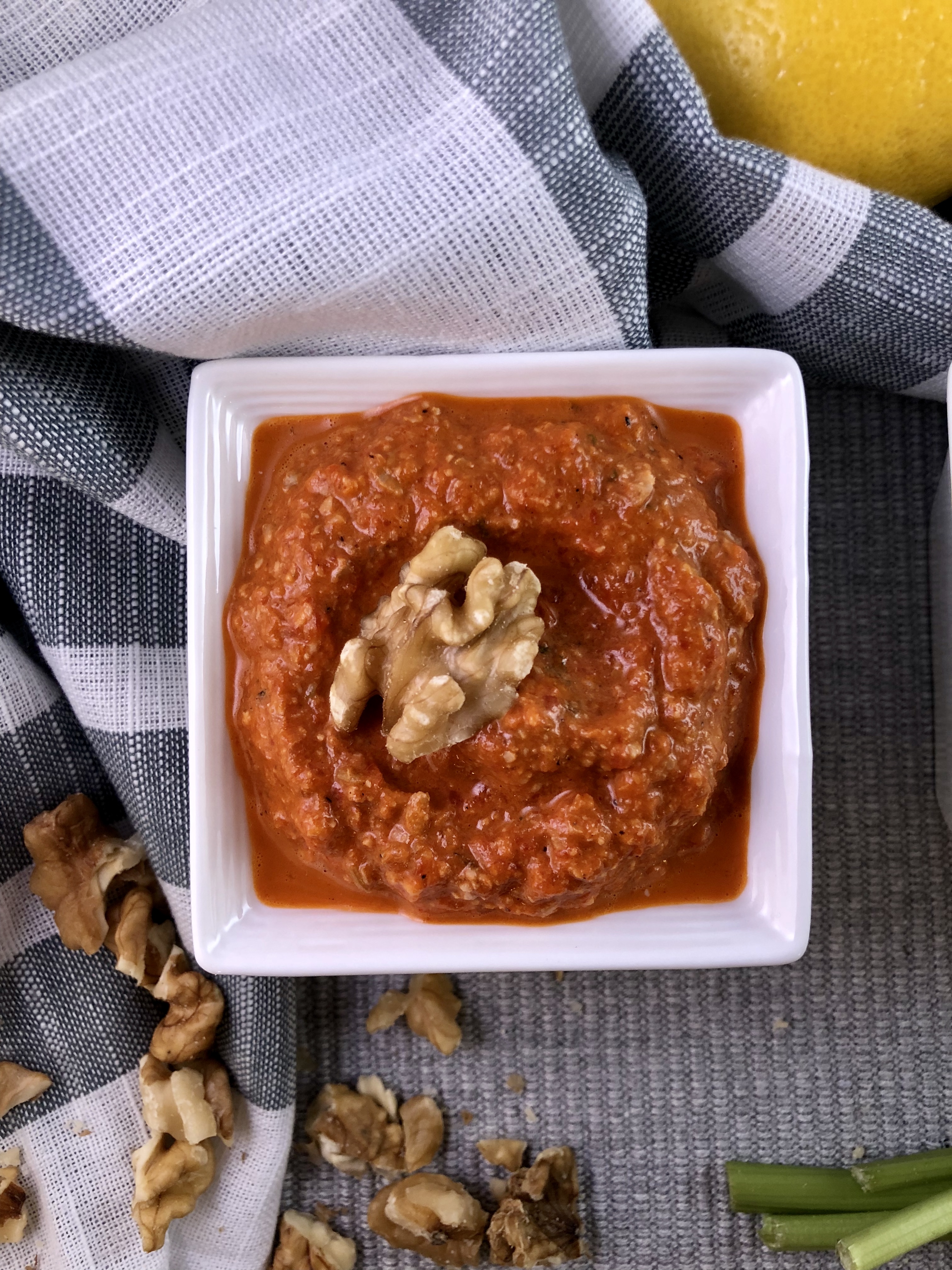 1. Using a blender or a hand blender, blend ingredients together until almost smooth – you want some texture. Taste for salt. Pour into a serving bowl and top with toasted walnuts (optional) and a drizzle of olive oil